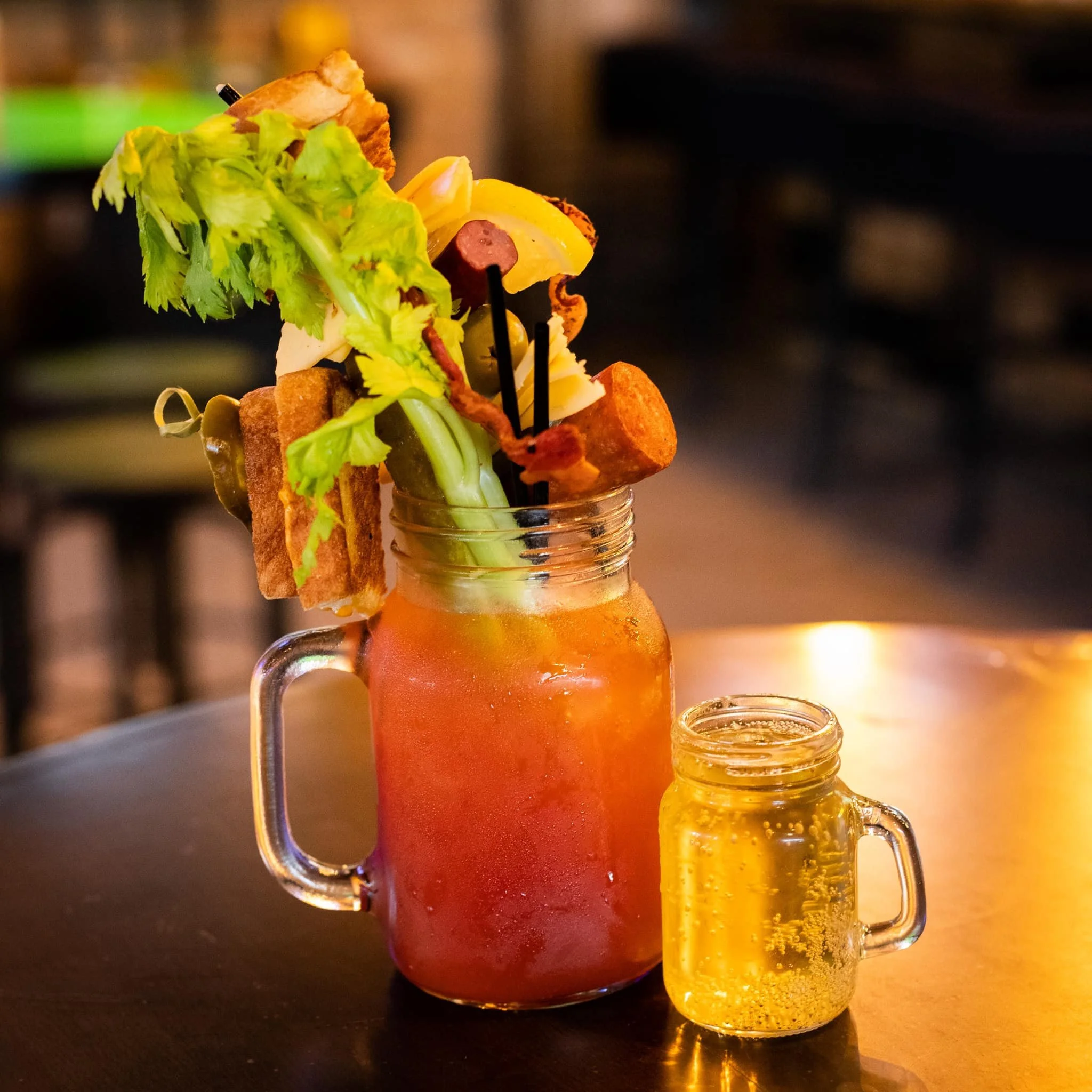 If you’re looking for the perfect brunch spot, The Spud Jr. is your place! With savory caesars, sweet mimosas, and brunch flavors like no other, you are sure to find something delicious to enjoy! If you’re a caesar lover, you have to try The TOWER Bloody! This bloody is your choice of mary or caesar, house infused pepper vodka; served with a pickle, olives, celery, jalapenos, pepperjack cheese, cheese curds, cheddar cheese, a beef stick, sausage, bacon, a saucy nug, grilled cheese, lime, and a lemon slice!