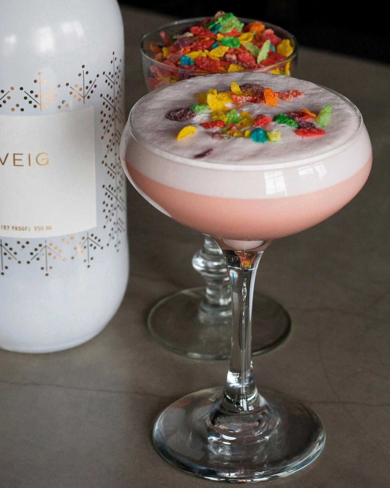 Have you ever had a cocktail with fruity pebbles on top? Sky’s Dino’s Gin Fizz is a fruity cocktail made with Far North Solveig gin, lemon, lime, egg white, Aperol, Fruity Pebbles syrup, club soda, and cream! This sweet cocktail is so delicious you won’t be able to have just one!