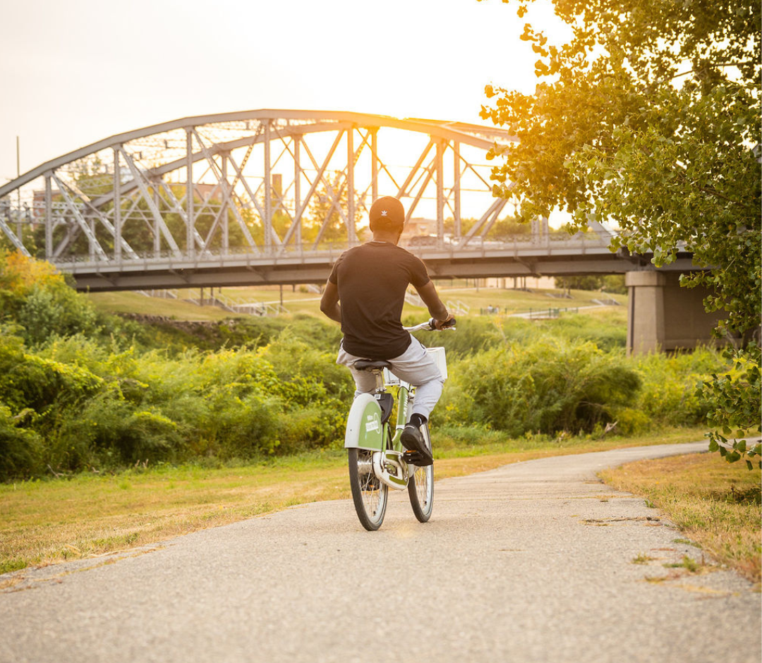 Find a bike at the Town Square rack or a rack downtown! Hop on your Grand Rides bike and head toward the Greenway, the miles-long trail system that follows the Red River. This stretch is the highlight of your ride—smooth paths, gorgeous river views, and plenty of quiet nature moments that feel like a true getaway (without leaving the city)!